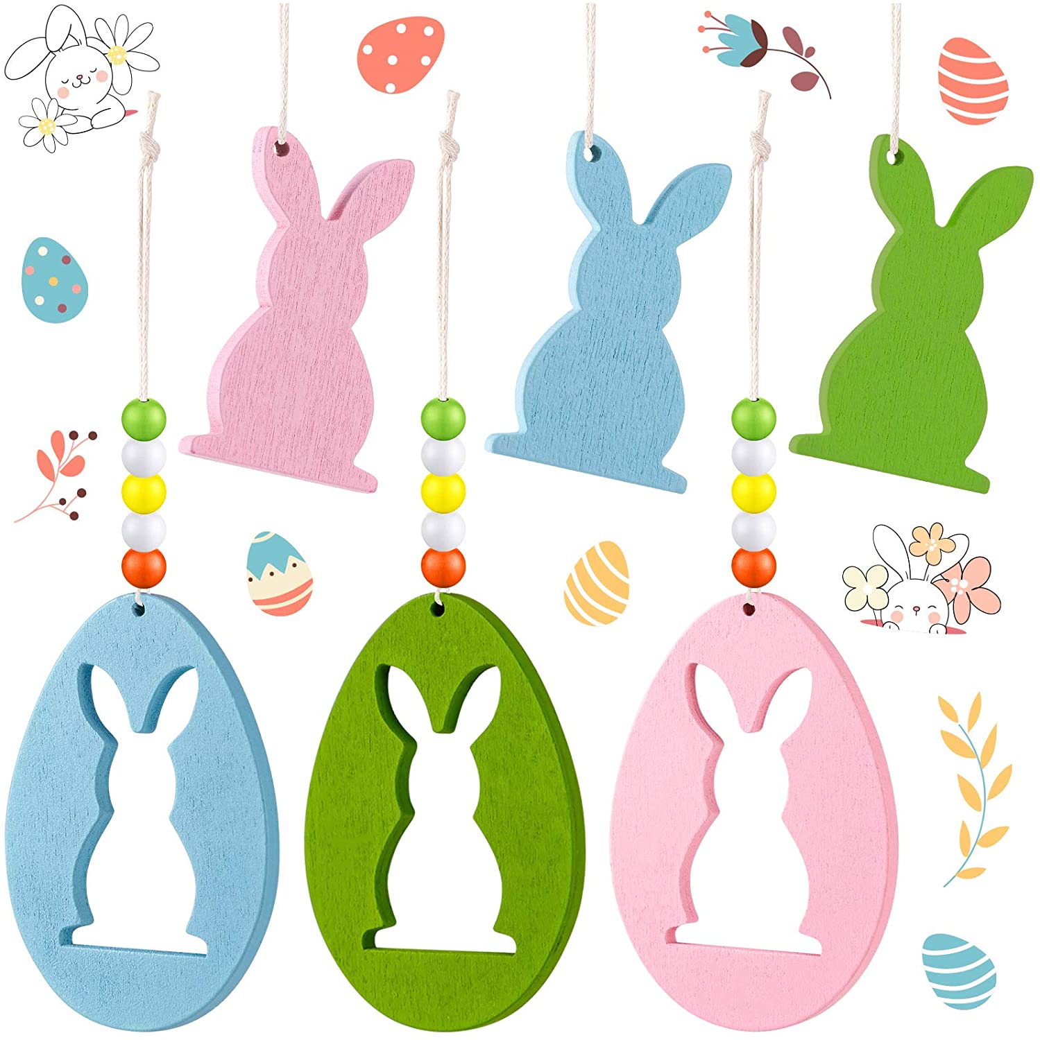 - Material and Size: These amazing Easter wooden hanging ornaments are made of carefully selected wood, which are not easy to damage, light in weight, safe with no peculiar smell, so you can feel free to let your children play with them. Egg Size: 7.8*5.8 cm, Bunny Size: 5.2*3.3 cm, having three color (blue, pink, green).